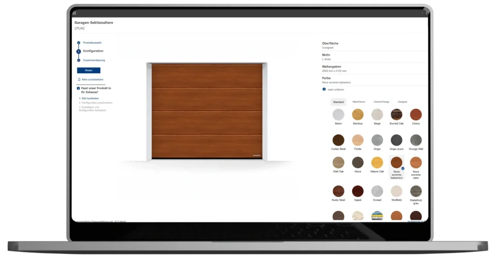 Mit dem Online-Konfigurator können Sie Ihr Garagentor individuell gestalten – wählen Sie Oberfläche, Farbe und Größe und probieren Sie unterschiedliche Varianten aus.