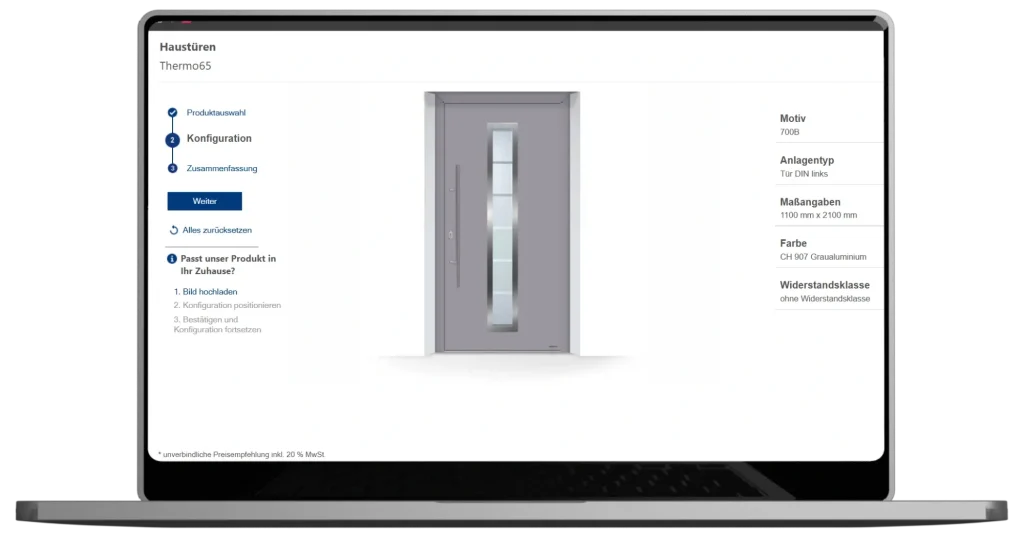 Mit dem Online-Konfigurator können Sie Ihre neue Tür individuell gestalten – wählen Sie Oberfläche, Farbe und Größe und probieren Sie unterschiedliche Varianten aus.
